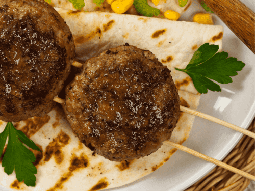 Grind meat and fat through 45 mm 18 plate. Deep fry the sausage patties.